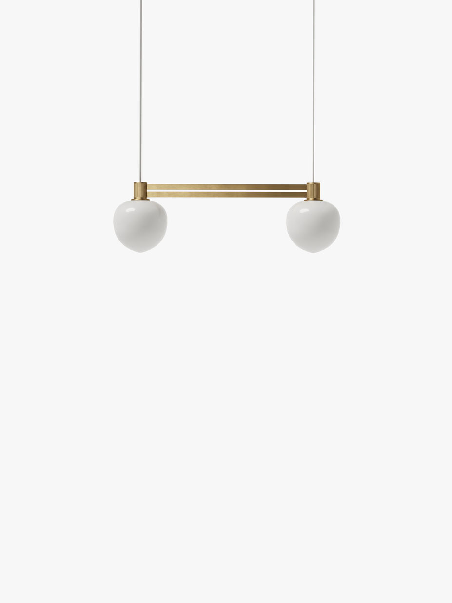装飾的なセンスを持ちながら様々なコンポジションを生み出すことができるモデュールエレメントをコンセプトに開発されたモデルです。「常にシャンデリアの装飾性に魅了されてきた (GAMFRATESI)」というように、古典的なシャンデリアの造形を現代的なテイストに落とし込むことによってシンプルでありながらも様々なシチュエーションに合致する多彩な拡張性が実現されました。歴史的なスタイルを連想させる柔らかいフォルムを持つ3層オパールのガラスグローブとは対照的に、合理性を感じさせるダブルのメタルアームとリブを持つシェードホルダーが MEMOIR をよりモダンでグラフィックな存在として際立たせます。MEMOIR は居住空間とホスピタリティー空間の両方にマッチするようにデザインされ、鮮やかなコントラストをもった彫刻のような存在です。