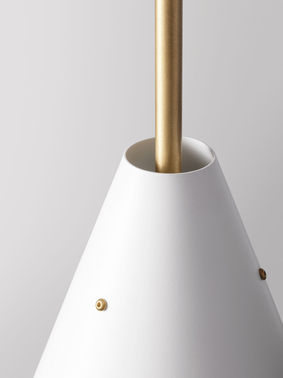 「MOSAIK」は幾何学的な原理に基づいたシンプルで機能的な照明システムです。フレームとなる真鍮製のシャフトとコネクターを組み合わせ、様々なニーズに対応できる豊富なバリエーション展開を想定してデザインされました。シンプルな円錐形のシェードは効率的で快適な光をもたらし、シェードトップからほのかに溢れる光が真鍮製のシャフトを照らします。3つのサイズバリエーションに加え、UP/DOWNでは遊び心を感じるような上下方向に向けられたシェードによりダイレクトライトとアンビエントライトの両方の特性を取り入れ、SIDEBYSIDEペンダントは連結されたシェードがテーブル全体を包み込みます。